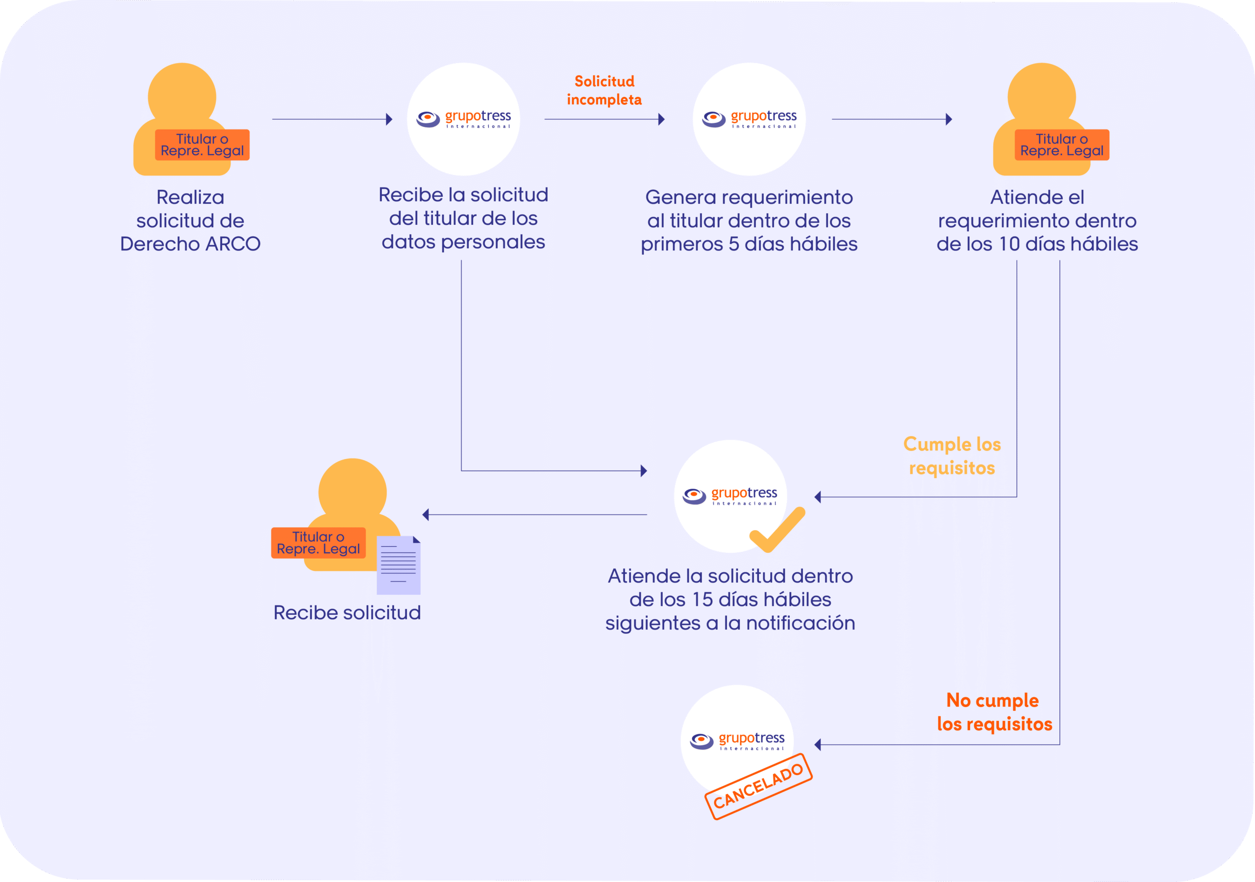 El Departamento de Privacidad de Datos Personales de GRUPO TRESS INTERNACIONAL le comunicará la determinación adoptada, en un plazo máximo de veinte (20) días hábiles contados desde la fecha en que se recibió la solicitud, a efecto de que, si resulta procedente, haga efectiva la misma dentro de los quince (15) días hábiles siguientes a que se comunique la respuesta. La respuesta se proporcionará vía electrónica a la dirección de correo que se especifique en su solicitud.