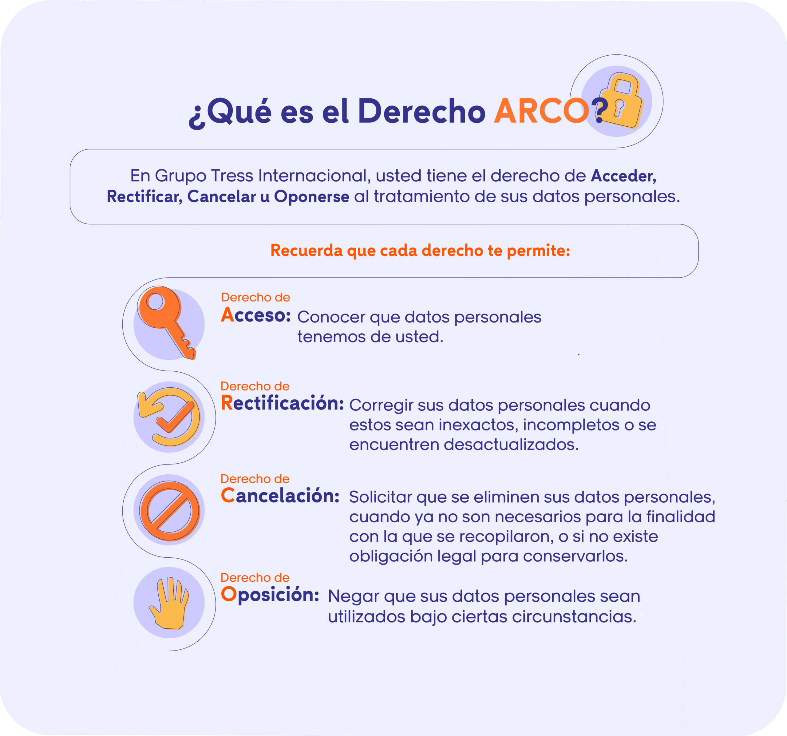 En todos los casos legalmente procedentes, usted o su representante legal, podrá ejercer cualquiera de los Derechos de Acceso, Rectificación, Cancelación y Oposición (en lo sucesivo, Derechos ARCO), así como a Revocar su Consentimiento para el tratamiento o transferencia de sus datos personales, por lo que en cualquier momento podrá enviar una solicitud a nuestro Departamento de Privacidad de Datos Personales a través del siguiente correo electrónico: privacidadGTI@tress.com.mx.