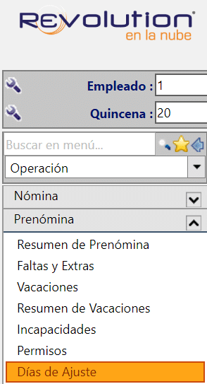 En el menú de opciones da clic en Prenómina y en las opciones que se muestran selecciona la opción Días de Ajuste. También puedes escribir la opción Días de Ajuste en el campo de buscar y presiona Enter.