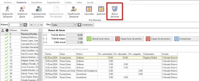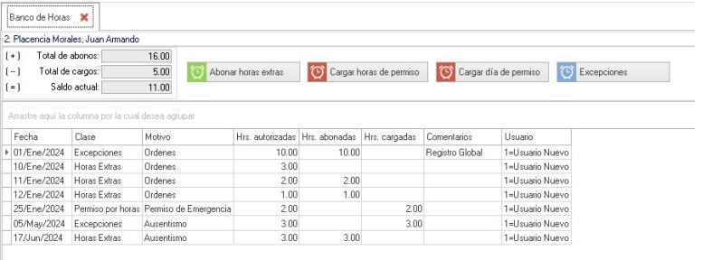 Se cuenta con una ventana donde se podrá administrar el banco de horas del empleado, desde esa ventana se podrá consultar el saldo de horas del empleado y realizar cargos o abonos al banco de horas.