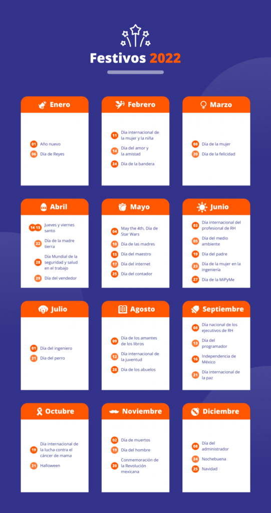 Como cada año, te compartimos las fechas operativas, descanso obligatorio y algunos días festivos a considerar en este 2022 que nos recibió con cambios en recibos fiscales y la continuidad al nuevo servicio de intercomunicación de avisos Infonavit. También habrá que estar atentos al cumplimiento de la NOM-035, pues ya iniciaron las auditorías.