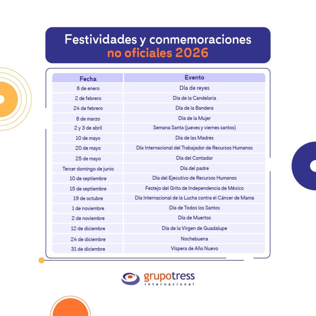Organiza tu planeación con ayuda de esta guía-calendario de días festivos, descansos y puentes 2026, y apóyate en las soluciones para Recursos Humanos que Grupo Tress Internacional pone a tu disposición: Sistema TRESS, Revolution en la nube y +ORDEN.