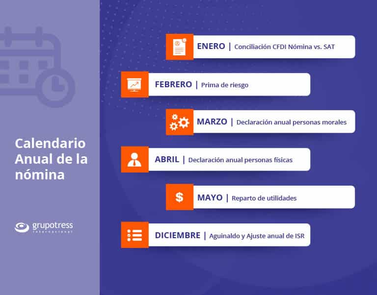 - Diciembre: entrega de aguinaldos y cálculo anual de salarios (ajuste anual de ISR)