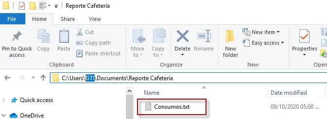 - Crear un archivo local con extensión .txt en una ruta con acceso para el usuario firmado en la estación de cafetería, ejemplo: C:\Users\GTI\Documents\Reporte Cafetería\Consumos.txt