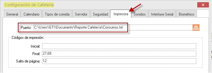 - Ingresar al Configurador de Cafetería y en la pestaña de Impresora, indicar la ruta completa y nombre del archivo creado en el campo Puerto.