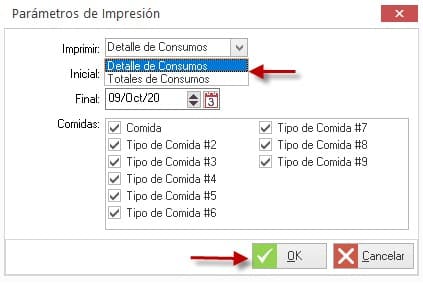 - Se cuenta con 2 opciones por default desde la estación de cafetería, seleccionar el reporte requerido y tipos de comida que apliquen y hacer clic en el botón OK.