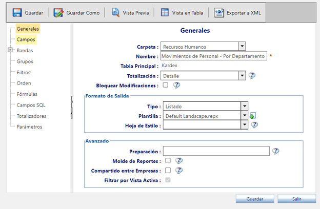 Por medio del icono del lápiz o dando doble clic en el reporte de nuestro interés, nos aparecerán las opciones de modificación del reporte:
