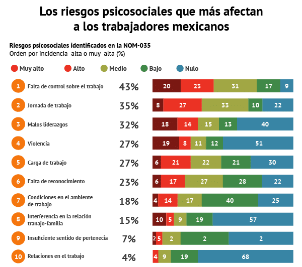 De acuerdo a un artÃculo publicado por El economista y con datos del Observatorio de factores psicosociales y bienestar organizacional (OFAPBIO), estos son los riesgoas que más afecta a los mexicanos.