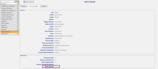 ¿Dónde puedo activar o desactivar el global? El global se encuentra en el escritorio Catálogos en la sección Globales > Valores Globales > Alta de Empleado