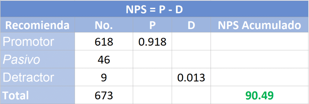 El NPS se basa en una sola pregunta: ‘¿Cuán probable es que se recomiende el producto o servicio a un familiar o amigo?’ Para ello se les pide calificar en una escala de 0 a 10, donde 0 es ‘Muy improbable’ y 10 es ‘Definitivamente lo recomendaría’. Según los resultados, los clientes se clasifican en promotores, pasivos y detractores. Los promotores califican con 10, 9; pasivos con 8, 7; y detractores con 6 o menos. Para obtener un resultado se restan los detractores a los promotores y se obtiene un porcentaje, a manera de medir la calidad del servicio: