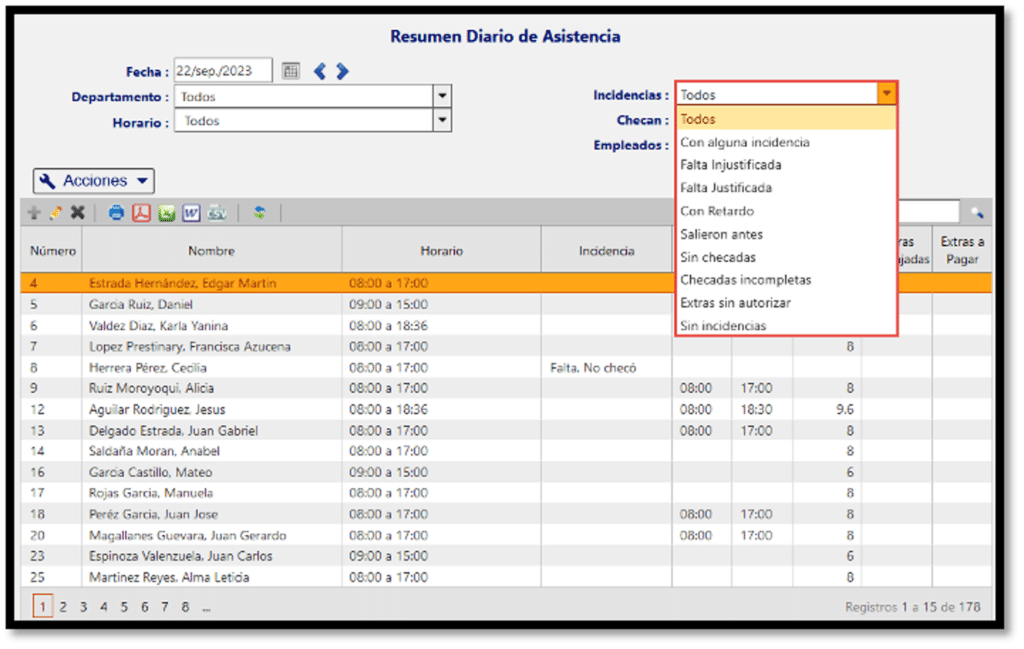 - Gestionar las checadas, retardos, faltas, horas ordinarias y autorizacionesÂ