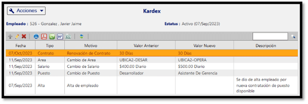 - Consultar los datos personales, datos de contratación, datos de área de trabajo, kárdex, vacaciones, incapacidades y permisos de los empleados