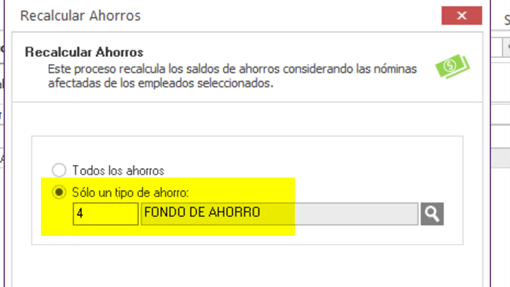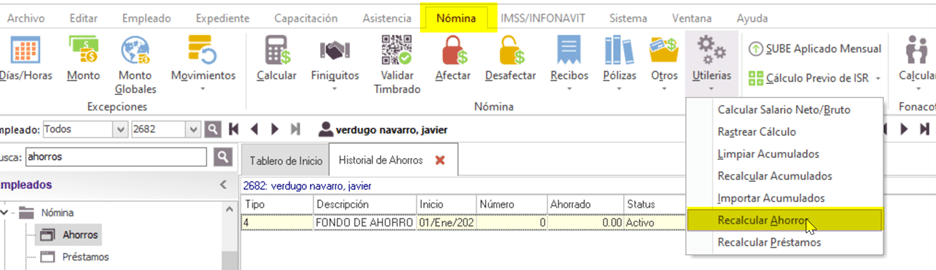 2. Con el paso anterior podremos correr un proceso adicional que se llama recalcular ahorros: Este se encuentra en la pestaña de proceso de Nómina/ Utilerías /Recalcular Ahorro: