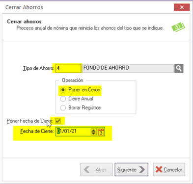 - Poner en ceros: El proceso aplica el cierre de todos los ahorros poniendo en cero su saldo y borrando los cargos y abonos. En esta opción usted puede indicar la nueva fecha de inicio para el ahorro. Para indicar la nueva fecha de inicio, utilice la opción »Poner fecha de cierre’.