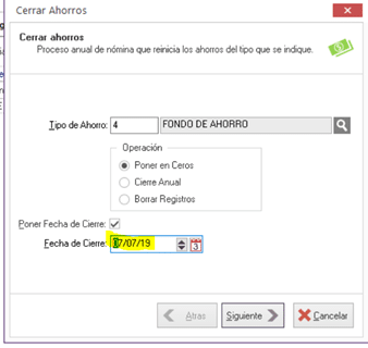 5. Seleccionar el tipo de ahorro/poner en cero/activar la opción de “Poner fecha de cierre”, y seleccionar la fecha donde se iniciará nuevamente con el descuento de la prestación.