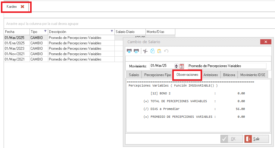 Cuando se usa la fórmula IMSS_VARIABLE ( ) se guarda el rastreo del cálculo incluyendo el detalle de los conceptos de nómina que gravan para IMSS y dÃas cotizados. Este rastreo se puede consultar desde el movimiento aplicado en el kárdex del empleado, pestaña Observaciones.Â
