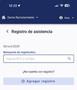 - Registra la llegada (asistencia) de candidatos desde el celular y toma la fotografÃa; la información se envÃa a la aplicación de reclutamiento en tiempo real.