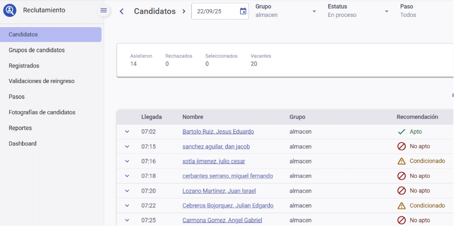 - Visualiza a los interesados en cada vacante, candidatos que asistieron, avance por grupos, candidatos pendientes por paso y estatus por candidato.