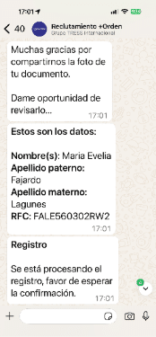 En procesos de reclutamiento masivo, cada minuto cuenta. Reclutamiento +ORDEN simplifica la gestión de candidatos desde el preregistro, reduciendo tiempos, errores y tareas repetitivas. Desde un chatbot de WhatsApp, los interesados pueden preregistrarse, enviar sus documentos y recibir información de la vacante.