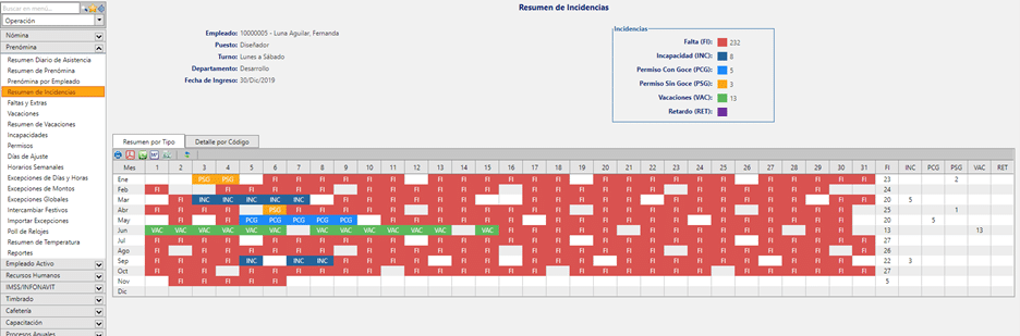 Visualizaremos gráficamente cada día en el que ocurrió una incidencia, en un calendario donde se identifican los diferentes tipos de incidencias con colores diferentes (el código de colores se encuentra en la parte superior derecha). También veremos los totales de cada tipo de incidencia en la parte derecha del calendario, así como en el encabezado de la consulta, junto al código de colores.