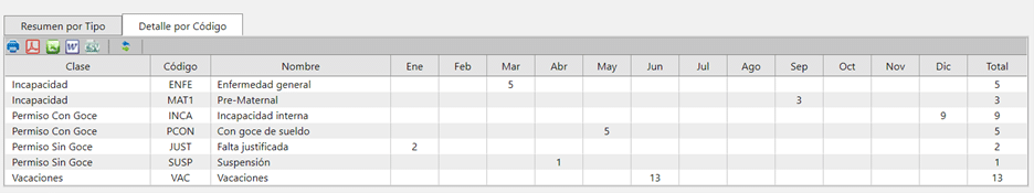 En la pestaña de “Detalle por Código” podremos ver más información de cada tipo incidencia y un conteo por mes.