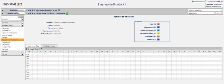 En Revolution podemos consultar un resumen de las incidencias que ha tenido cada empleado por año.