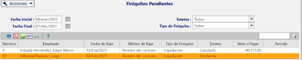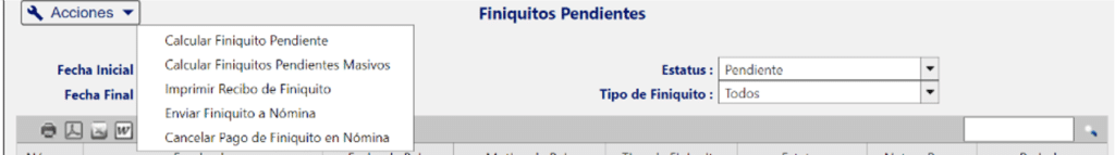 - Finiquitos Pendientes: Se agregó una nueva opción al menú de nómina llamada «Finiquitos Pendientes». Esta sección centralizó toda la información relevante sobre los empleados pendientes de finiquito, brindando una visión completa.